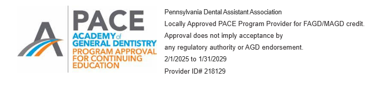 As of February 2019, the Pennsylvania Dental Assistant Association has been approved as an AGD PACE course sponsor.